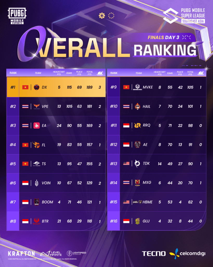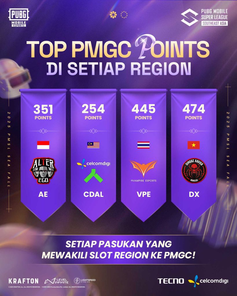 Malaysia kini akan bergantung kepada CelcomDigi Alliance (CDAL) yang layak ke PMGC 2025. Mereka bakal bertemu semula dengan D’XAVIER serta dua pasukan Thailand – Vampire Esports dan eArena – yang mara melalui kutipan mata. Dari Vietnam, Team Secret dan Team Flash turut layak, manakala Indonesia diwakili Alter Ego selepas mengekalkan kedudukan dengan beza tipis 3 mata daripada Bigetron By Vitality (BTR).