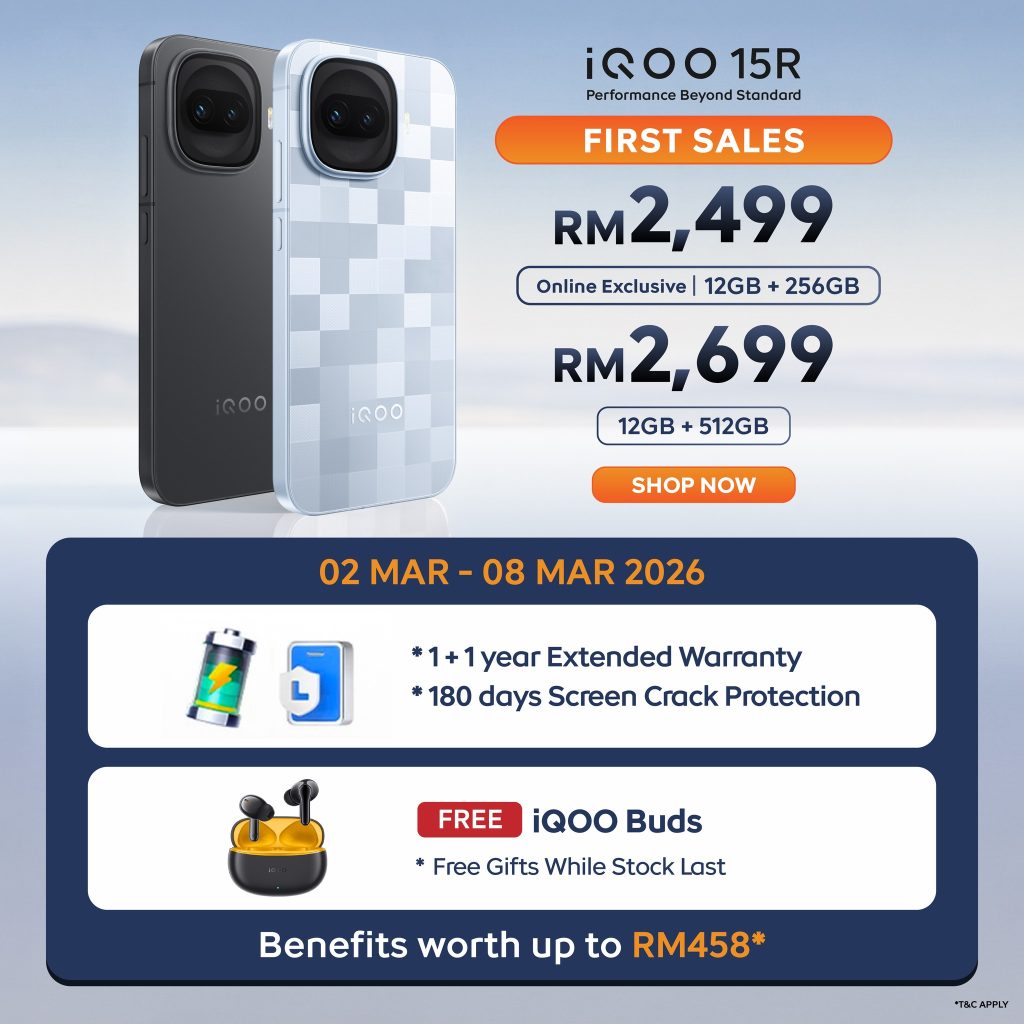 Pembelian antara 2 hingga 8 Mac turut menerima hadiah percuma bernilai sehingga RM458, termasuk iQOO Buds, lanjutan waranti 1+1 tahun dan waranti skrin retak selama 180 hari.