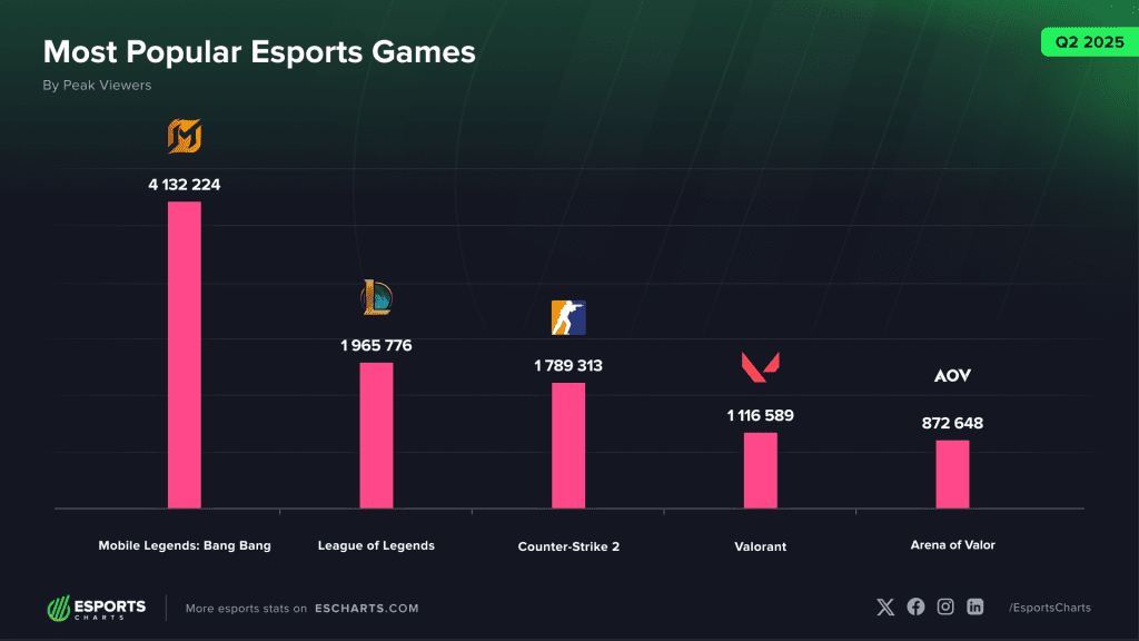 Pada suku kedua tahun 2025, MLBB dinobatkan sebagai tajuk esports paling popular di dunia, dengan lebih 4.1 juta penonton serentak — mengatasi gergasi PC seperti League of Legends. Kejayaan ini menegaskan kedudukan MLBB sebagai bukan sekadar permainan, tetapi sebuah platform hiburan global.